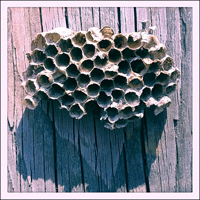 Behold this vacant wasp-comb fragment, photographed just moments ago in Northern New England. Note how our wasp counterparts invoke the hexagonal comb structure, while opting for wood-fiber construction over our wax secretions. Know your “Comb Architecture BUZZWORDS”!